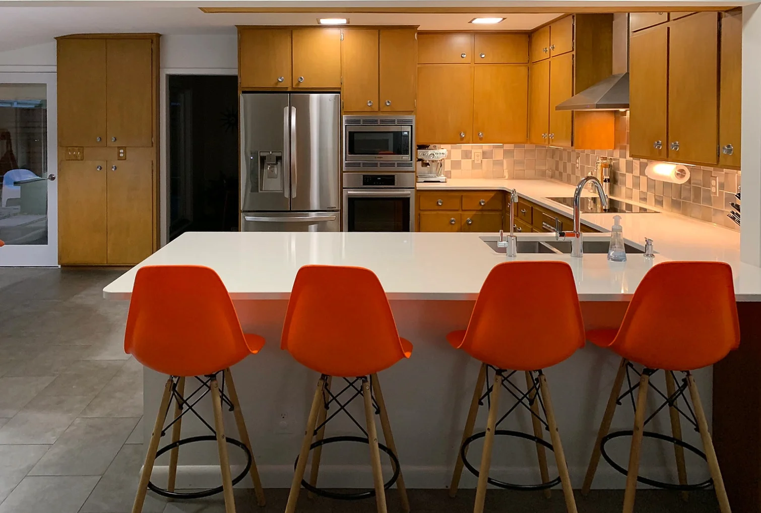 The kitchen itself still retains the majority of its original features—like a bread box complete with a dial-controlled warmer, quite a luxury for its day—along with some welcomed upgrades. The original countertop was replaced with Cambria natural stone counters, and the appliances were swapped for sleek, modern stainless steel ones that look right at home with the silver tiled backsplash.